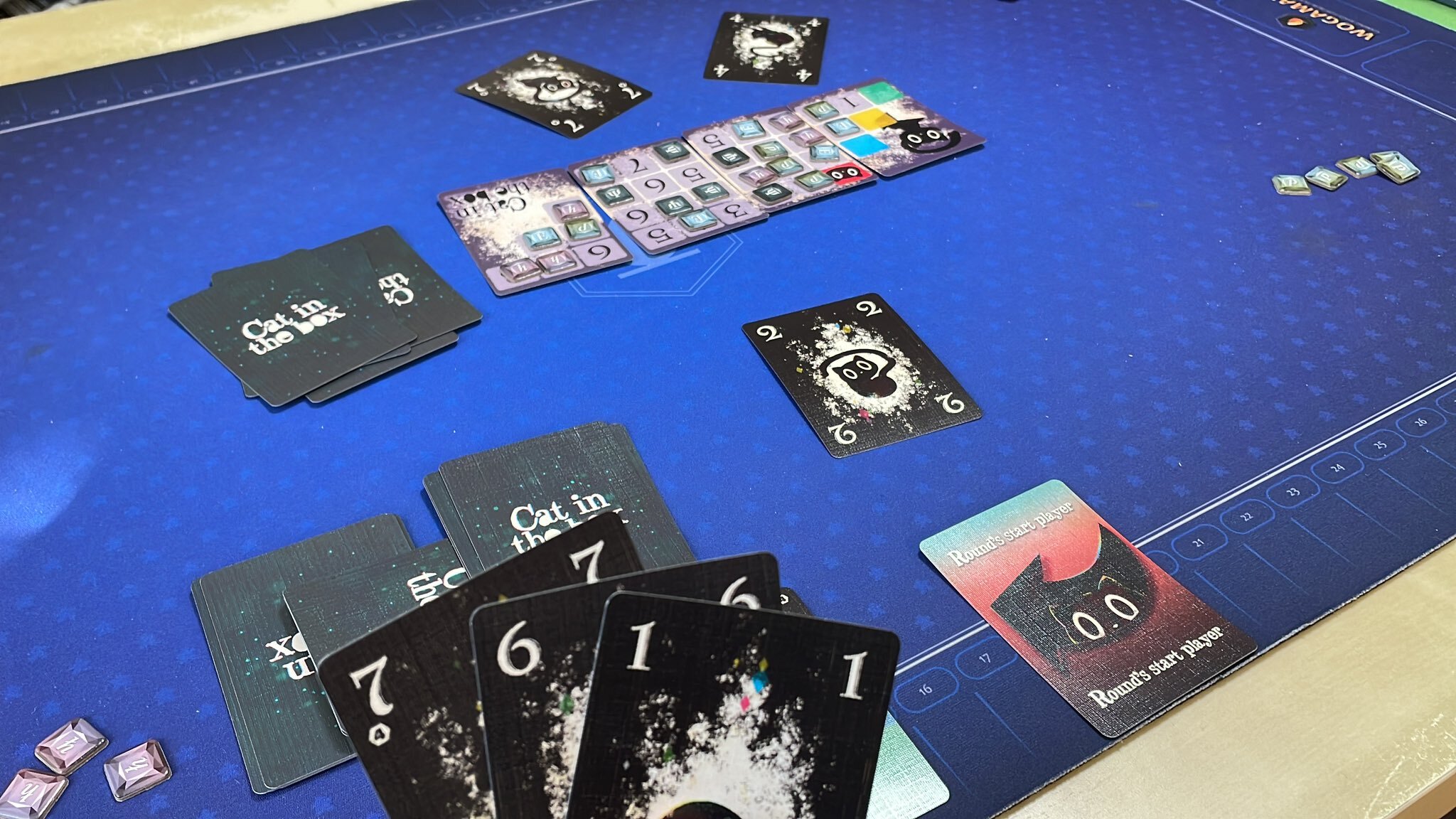 こうして、手番に「出せない」プレイヤーが出たら、ラウンドが即終了し、そのプレイヤーは得点をもらえません。(マイナス点をもらうこともあります。)