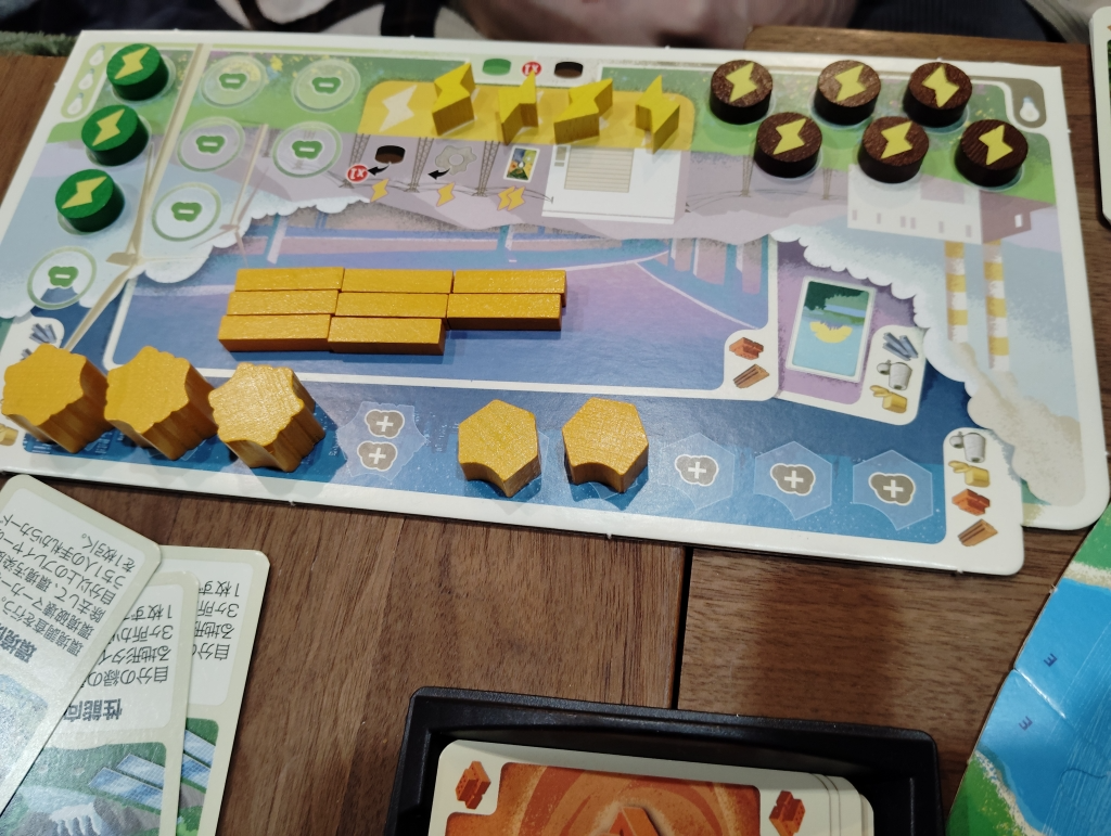 10点を早くに目指したいですが、ダイスの出目や環境問題要素による汚染した場所では1回は資源が獲得できなくなる要素もあり、テンポ自体がなかなかに悪い。