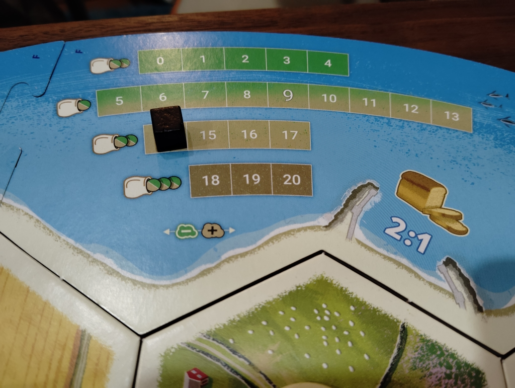 いつも通りに交渉の要素はあるのですが、今回は資源が獲得できる村や研究都市に隣接させて工場を建築していると研究カードやエネルギーが獲得でき、エネルギー2個を支払うことで好きな資源を獲得できたりしますので、交渉しなくてもなんとかできてしまうことが多いです。