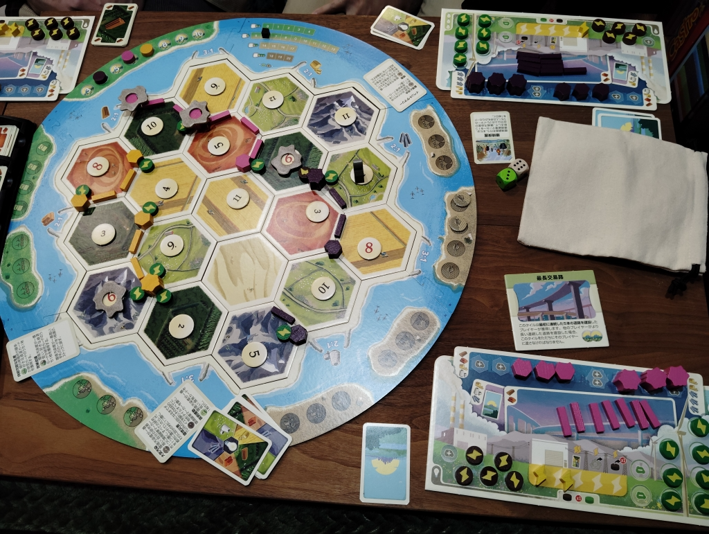 いつ通り、街道点による2点や盗賊ではなく環境調査員の2点もあったりとボーナスで伸ばしたりもできましたが、今回は先にチップが無くなりましてクリーンな工場をたくさん建設していたプレイヤーの勝ち。