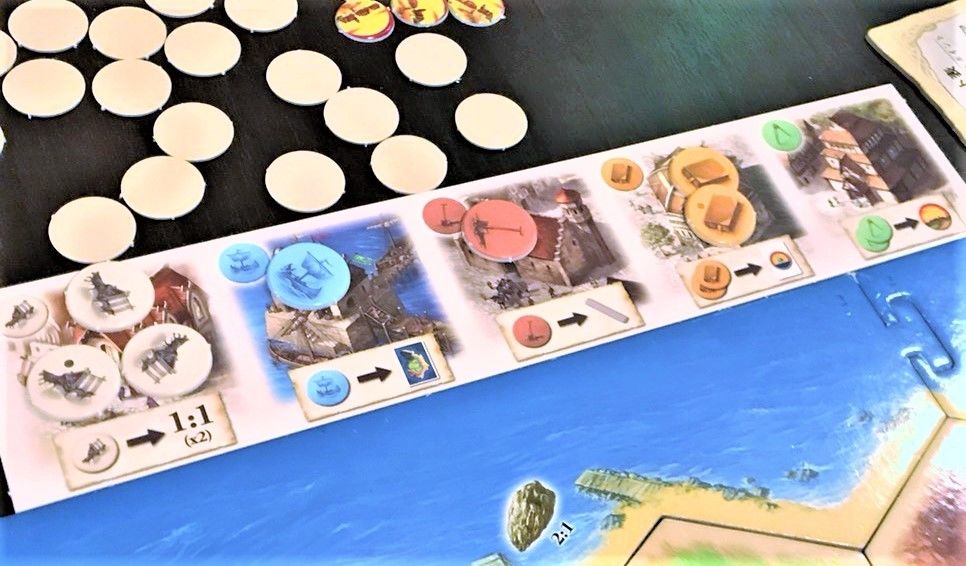 左から順にさっくり説明すると、「資源カード交換×2」、「資源カード1枚」、「街道1建設」、「発展カード1枚」、「勝利ポイントコマ1点分」です!