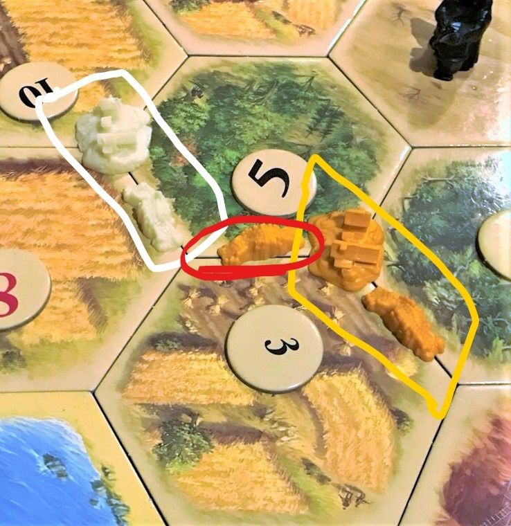 …スタンダードなカタンなら、こんな街道の建て方は通常起こりません…。人に繋げても行き止まりですもんね。