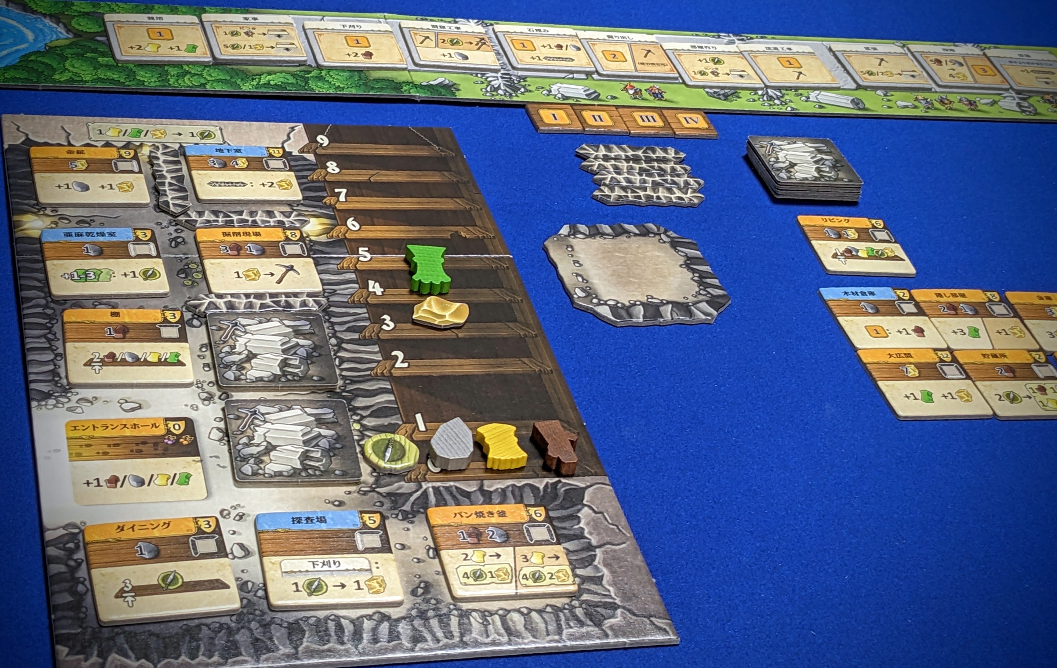 システムとしてはワーカーを使わないワカプレでアクションを行って、場にあるタイルを洞窟に配置していって得点の合計を高めていくのが目標となる。