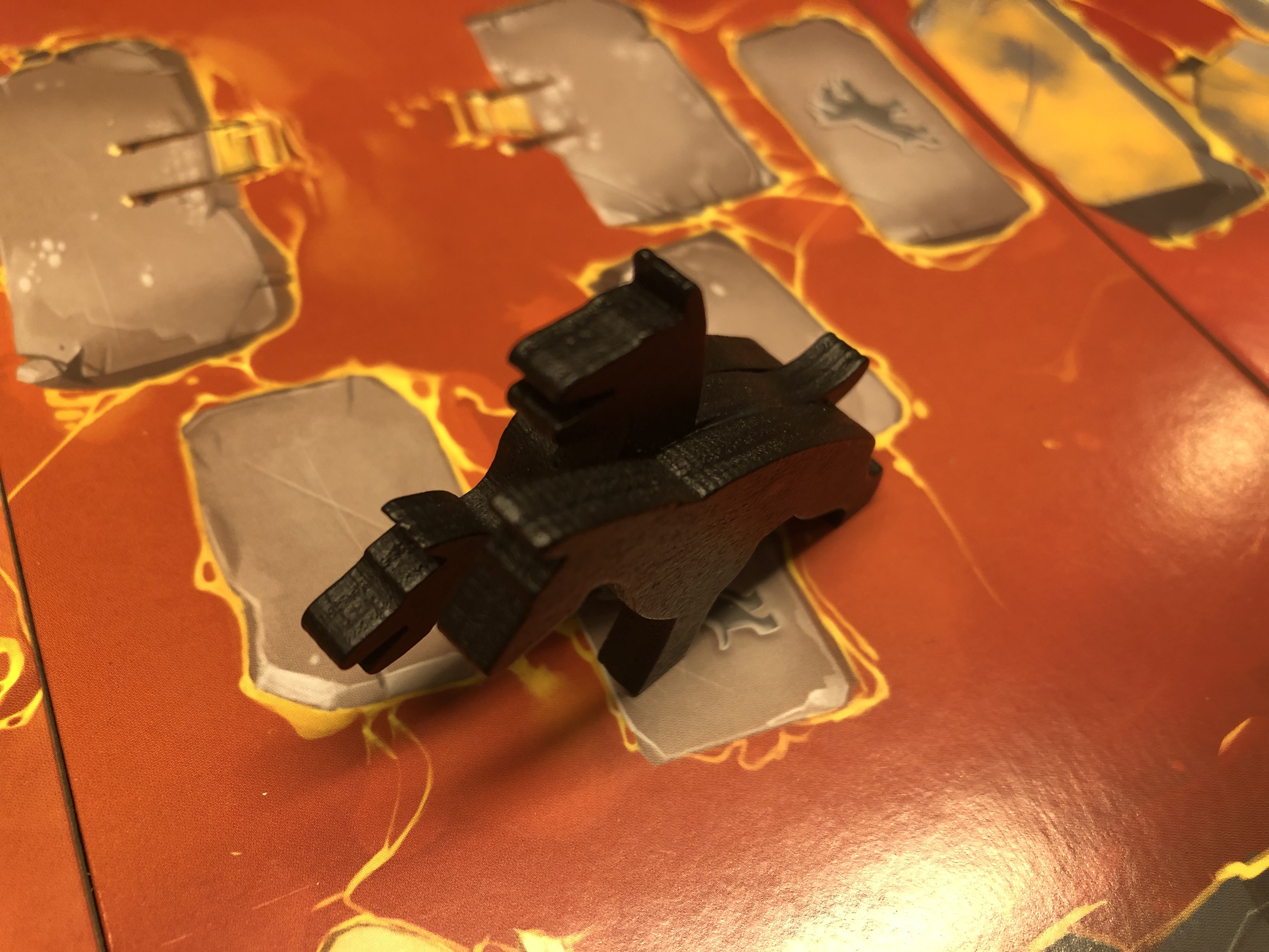 アクションを行うとたいていケルベロスサイコロが1つ進み、サイコロがいちばん端まで進むとケルベロスは目の数だけ進みます。ケルベロスに最初に追いつかれてしまったプレイヤーは地獄側につきます。基本的には船に乗って脱出できたら勝ちなんですが、地獄側についたプレイヤーは他のプレイヤー全員を食べると勝ちです。