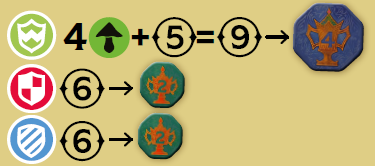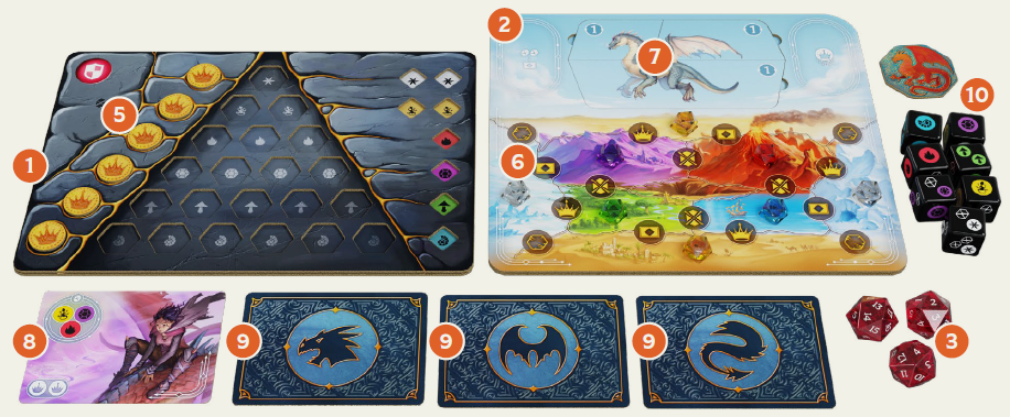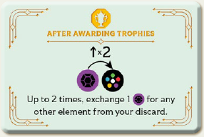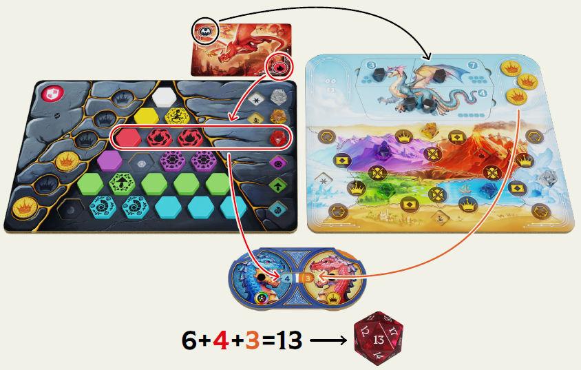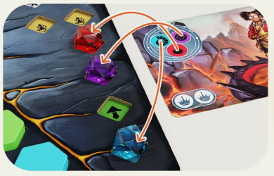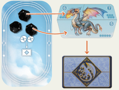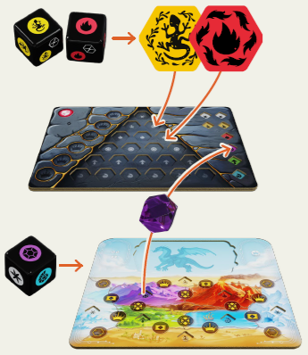 エレメントを獲得するには、受け取った各ダイスを2つのプレイエリア(エレメントピラミッドまたはトレーニンググラウンド)のどちらかに割り当て、対応する魔法のエレメントを獲得します。