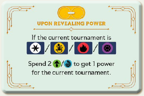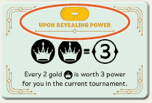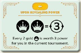 あなたのターン中に、置き場に少なくとも2つのゴールドがある場合、ただちに、ゴールド2つをドラゴンタイルのいずれか(同じタイルでも異なるタイルでも可)に移して、ゴールドごとにパワーを1ずつ増やします。 |
