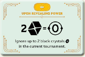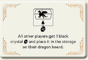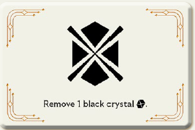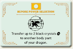 あなたのターン中にエレメンタルボード上に少なくとも2つのブラッククリスタルがある場合、ただちに、ブラッククリスタル2つをドラゴンタイルのいずれか(同じタイルでも異なるタイルでも可)に移して、それぞれにパワーを1ずつ減らします。 |