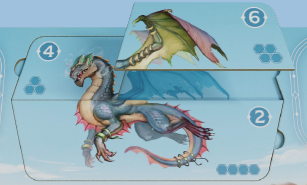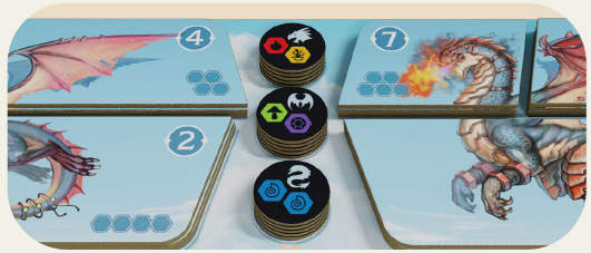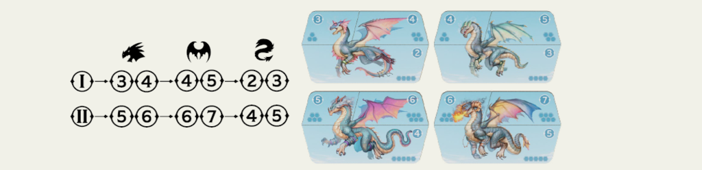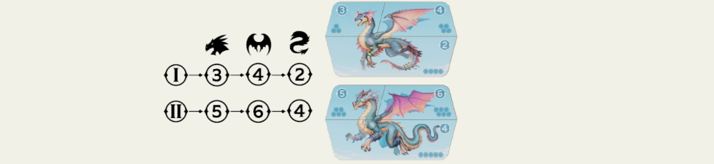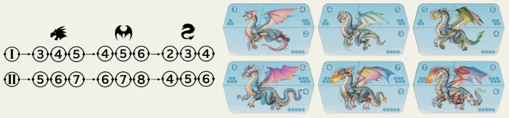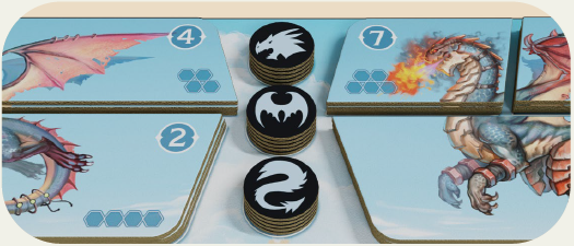 6. ドラゴンタイルを種類に応じて6つのスタックに分類し、ゲームボードに配置します:高度な翼、頭、尾の3つのスタックと、シンプルな翼、頭、尾の3つのスタック。シンプルなタイルは裏面に(I)があり、高度なタイルには(II)があります。タイルを、一番上の最大パワーから一番下の最小パワーの順に積み重ねます。プレイヤーの数に応じて、規定されたドラゴンタイルのセットが使用されます(次のページの図を参照)。