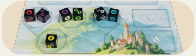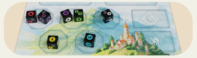 アクティブプレイヤーは7つのエレメンタルダイスを振り、任意の組み合わせでダイスエリアに分配します。各エリアのダイスの数は、以下に示すようにする必要があります。
