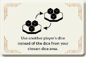 自分のターンの開始時に、エレメンタルダイスが残っているダイスエリアを1つ選択し、そのエリアからすべてのダイスをそのままの目で獲得します。このようにして、次のプレイヤーが選択できるエリアが少なくなり、最後のプレイヤー(ダイスを振ったアクティブプレイヤー)は2つのダイスエリアからのみ選択できます。