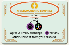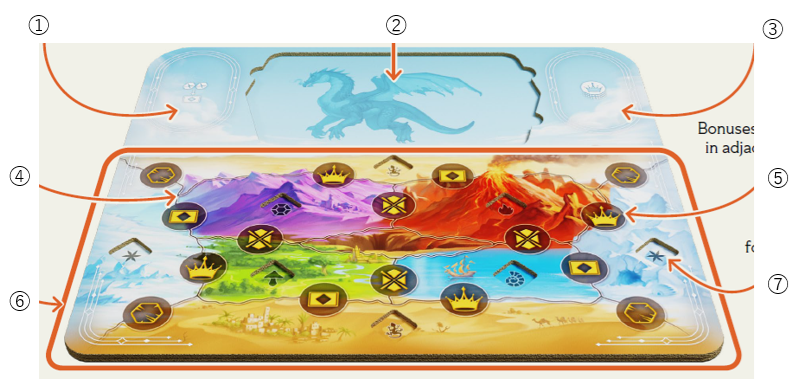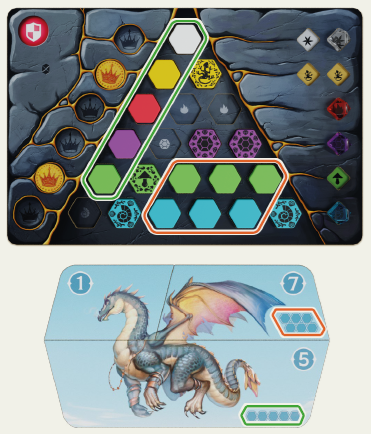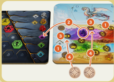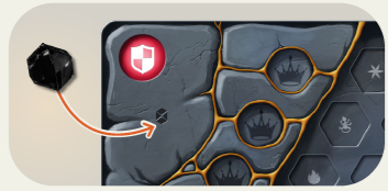 • トレーニンググラウンドに1つのダイスを割り当てた場合、描かれている魔法のクリスタルをあなたのドラゴンボードから取ってエレメンタルボードの右側にあるスロットに移します。
