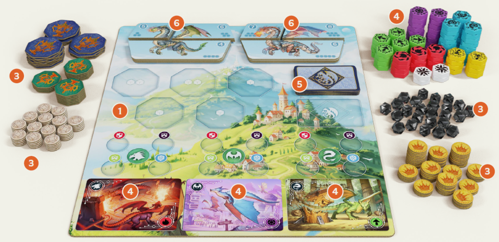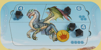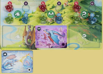 最初は、ドラゴントレーニングフェーズです。各ラウンド、プレイヤーはダイスを選択してボードに魔法のエレメントを配置し、それらを使用して特定のパターンを構築します。パターンを構築するのに十分な数の魔法のタイルを集めるとすぐに、それらを裏向きにしてアクティブにし、より強力な頭、翼、または尾のタイルを取得してドラゴンをアップグレードできます。
