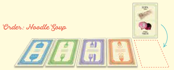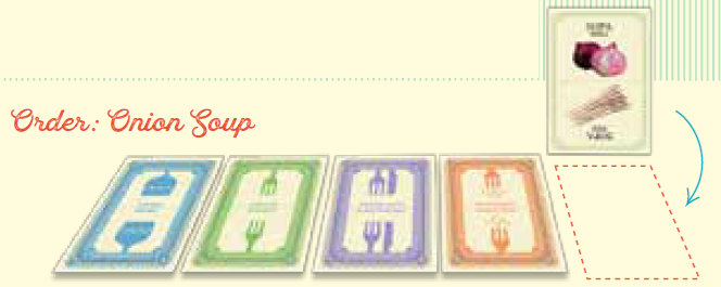 プレイヤーはキッチンからカード1枚を取り出し、その料理を注文した人の名前を言います。彼はそれを注文カードの上に置き、どちらの料理名が選ばれたかを言います。
