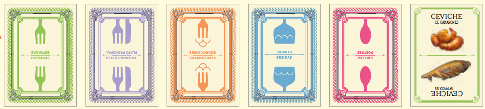 注文デッキは、前菜、メインコース、サイド料理、ドリンク、デザートの5つのカテゴリのカードで構成されています。カテゴリごとに10枚、各カードには2つの料理名が描かれています。