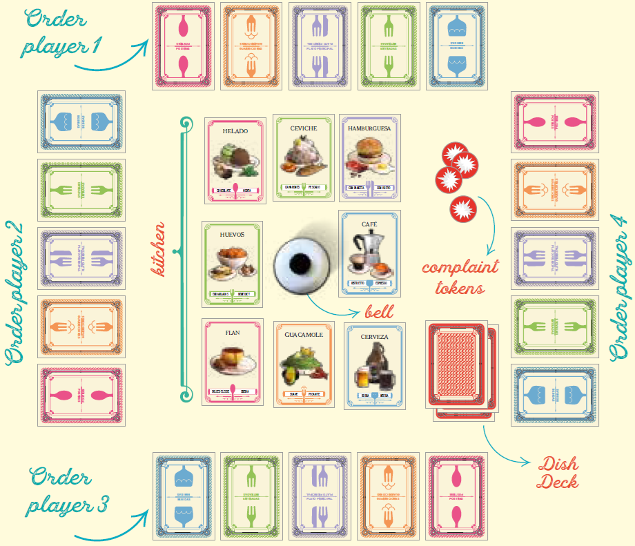 ゲームのディスプレイ: - 各プレイヤーの注文 - キッチン - ベル - 苦情トークン - 料理デッキ |