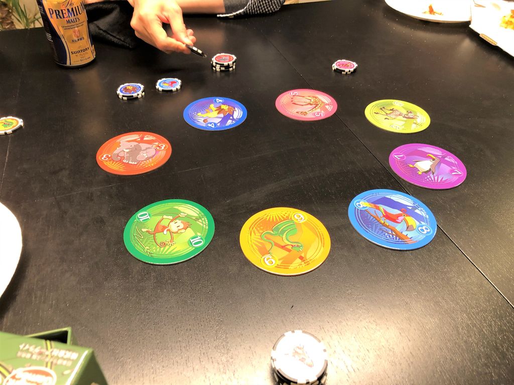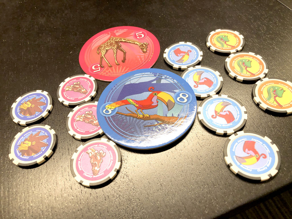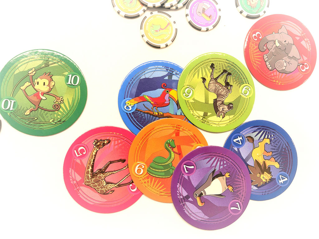 チップが全部なくなったときに、各動物ごとに1位になったらポイントをもらえます。猿で1位になれたら10点!ちなみにこの数字は得点でもあり、袋に入っているチップの数でもあります。猿チップは10枚も入っています。