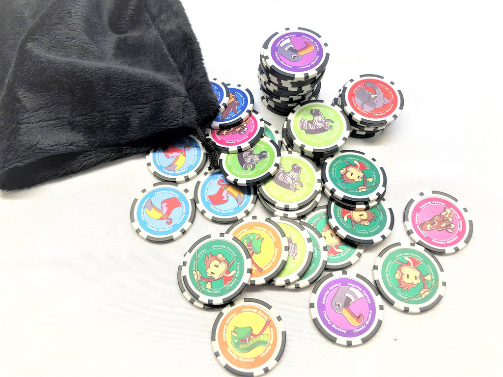 前のバージョンでは猿のぬいぐるみがついていて、なぜか動物が書かれたチップを猿の体から袋引きするっていう感じでしたが、新版ではふわふわの布袋になりました。しかもなんと新版ではまるでポーカーチップのような、重みがある良質なチップに変わりました!!52枚入っています。