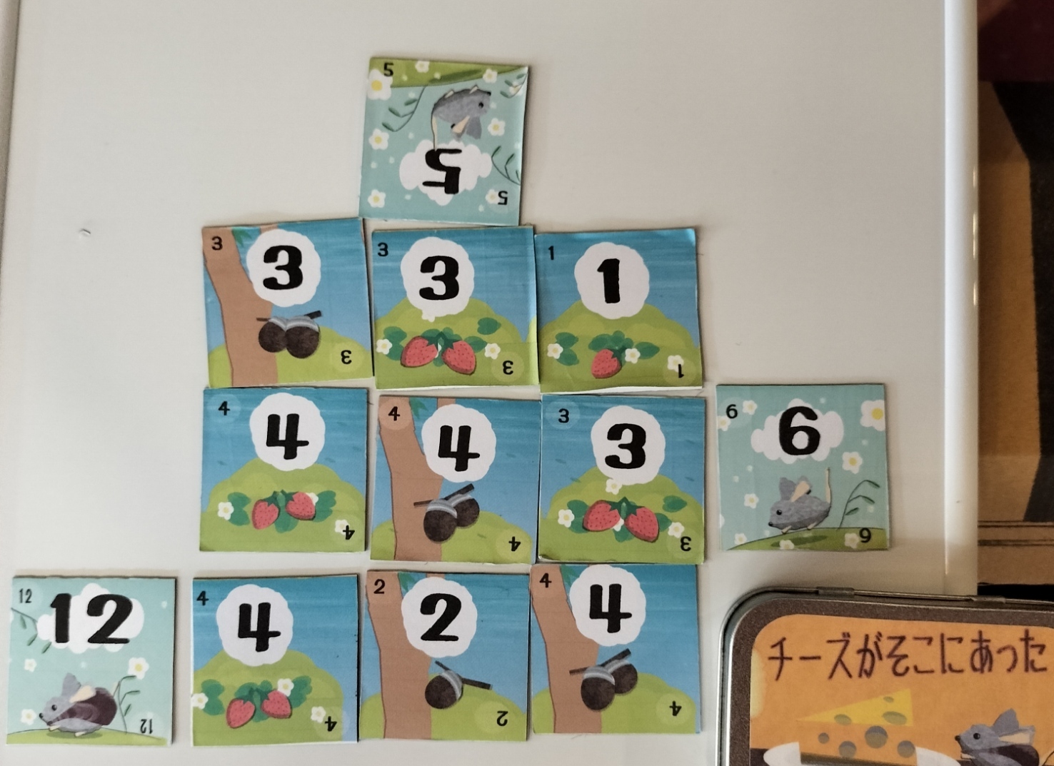 例えば、写真左下の「12のネズミタイル」のように置くと、右から順番にの4(いちごが2つ描かれているタイル)2(どんぐりが1つ描かれているタイル)と4(どんぐりが2つ描かれているタイル)全てが獲得できる!