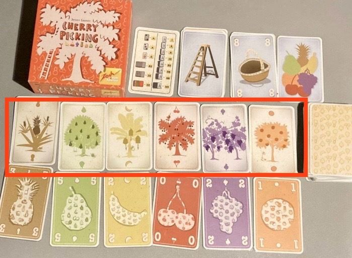 6ヶ所ある果物の木の下に1枚並ぶカードを、出したカードを交換する事で手元に収穫して