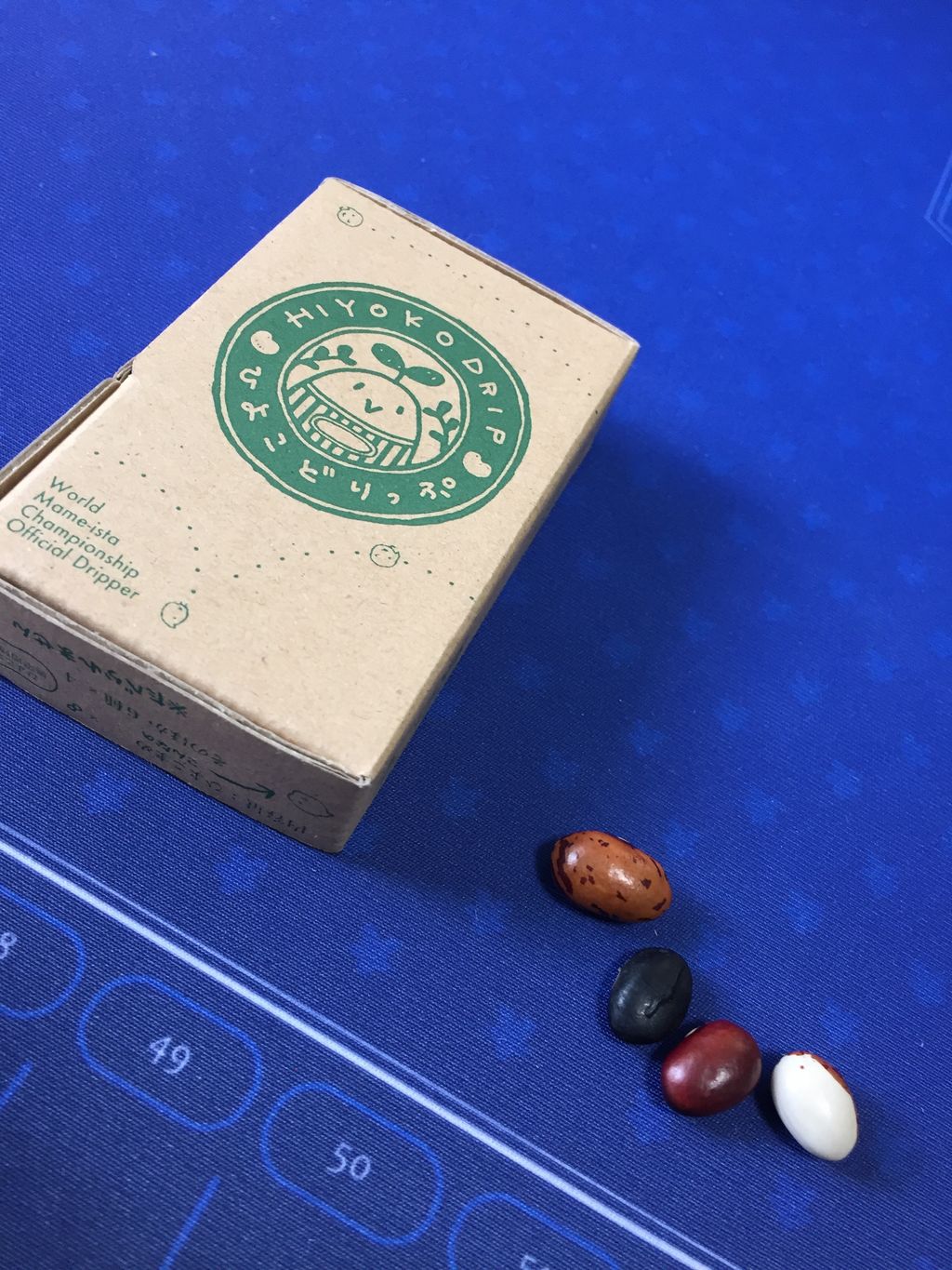 実際の豆が入った箱を縦に振り、特殊な形のした口から出てくる豆を集めます。好きなだけ出せますが、同じ種類か、別々の種類1個ずつしか出しちゃダメで、これに外れると、豆を取れず、手番が終わります。その前に手番を終えて、豆を集めましょう!