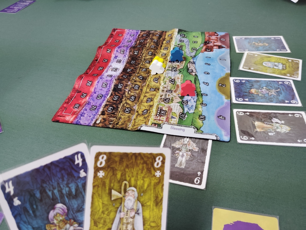 トリックフェイズ(探索)ではマストフォローの切り札ありで、1トリック獲得ごとに5点を獲得でき聖杯に近づけます。