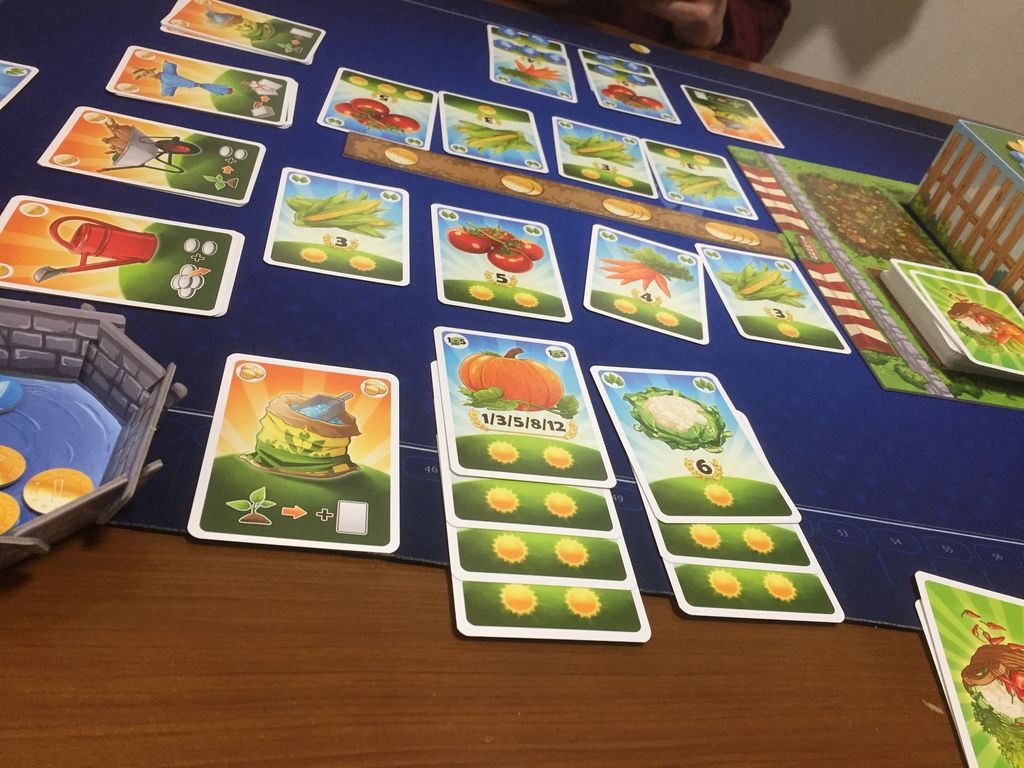 限られた手番数の中、上手く野菜カードを集め、自分の畑に巻き、可能なら水を与えて得点を上げるゲームです。