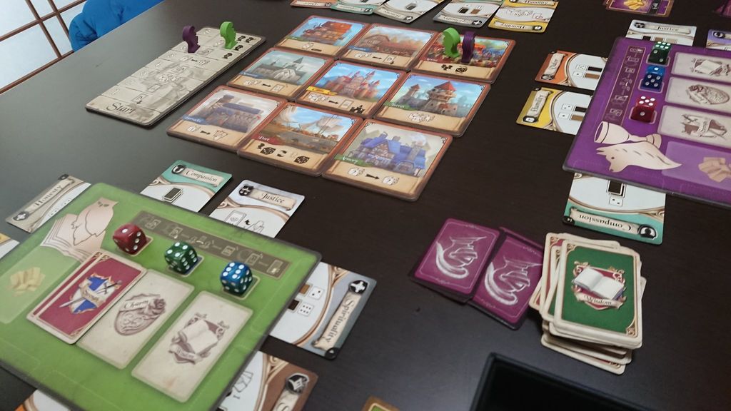 ソロプレイ感は確かに強いのですが、騎士コマか周回するタイルの中には、他のプレイヤーとサイコロの目を交換したり、全プレイヤーが同色のサイコロを振り直すなどの効果(その効果のタイルを使っている場合)があり、狙っている騎士道カードを直前で妨害されることもしばしばあります。