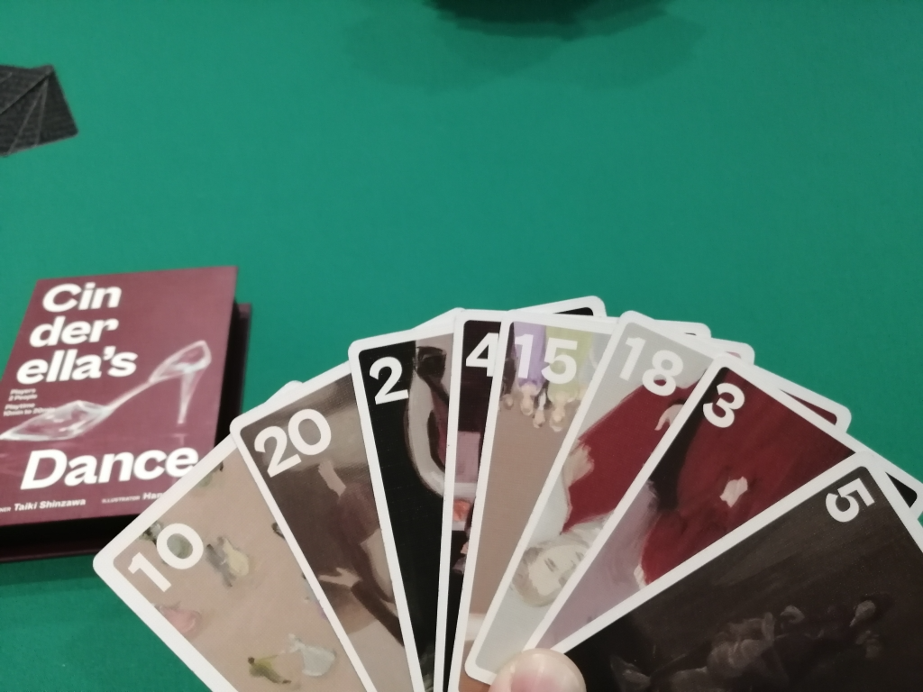 モノスートで数字は1〜21を使用で、しっかりとシャッフルしてお互いに8枚ずつ配られ手札となり、残り5枚は使いません。
