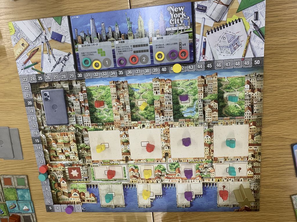 『シティーズ』は、ドラフトを軸に自分の都市を組み上げていくゲームで、個人ボードにタイルや建物を配置して得点を積み上げていきます。毎ラウンド提示される選択肢の中から、自分にとって最適な組み合わせを見つける作業には、各タイルの残り枚数と他プレイヤーの狙いといった先を読む力と、狙いのタイトルが取られた時にプランを変更する臨機応変さの両方が求められました。