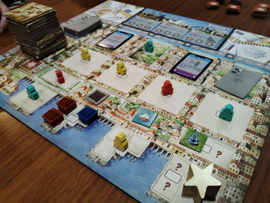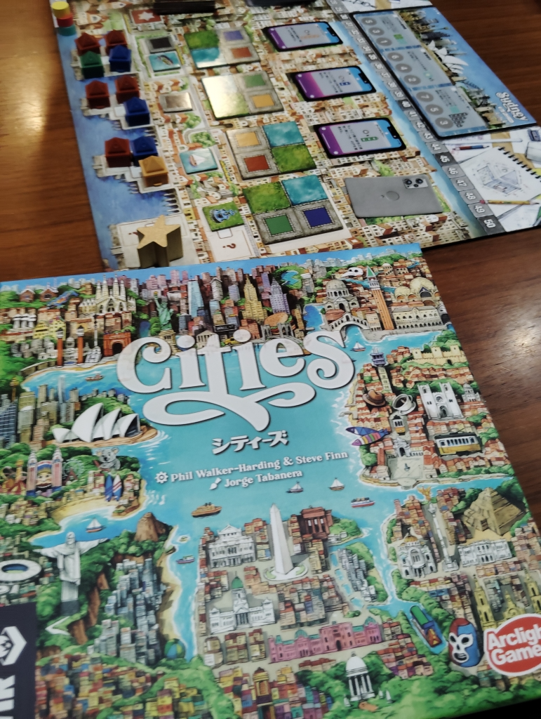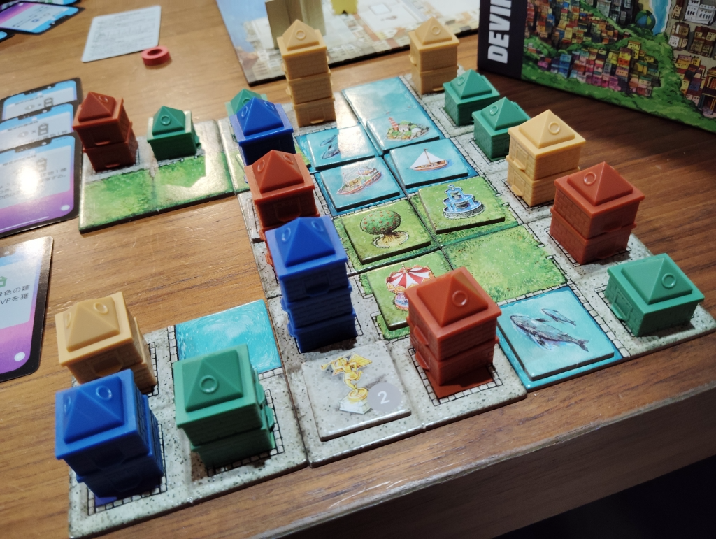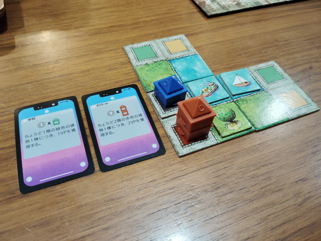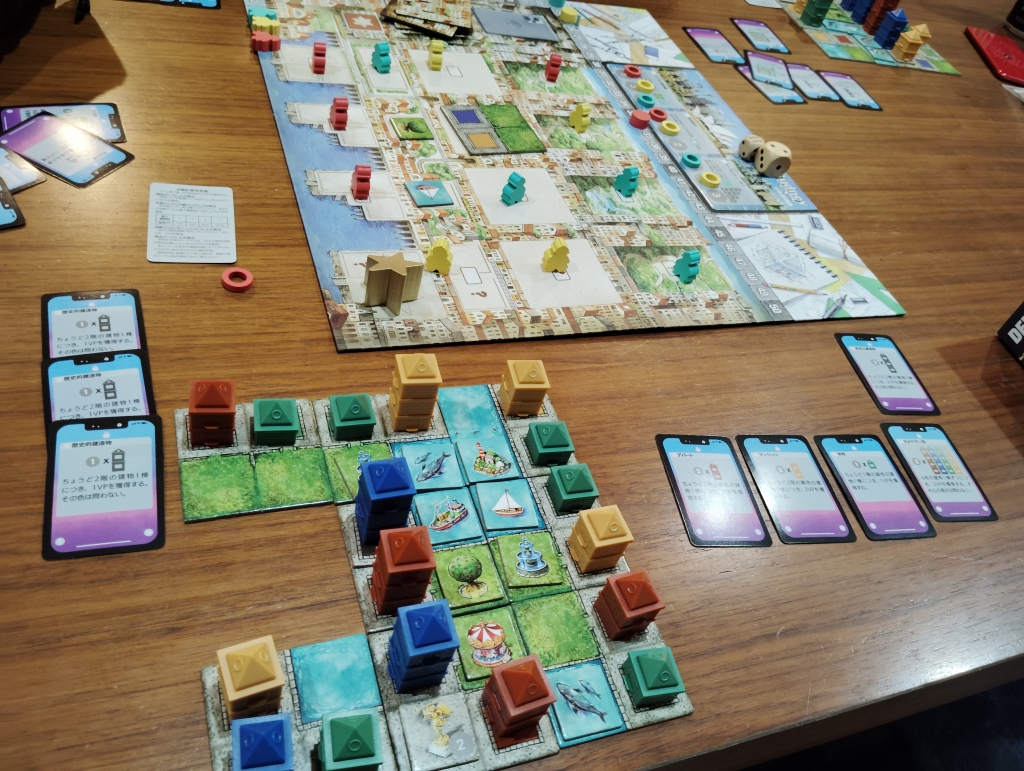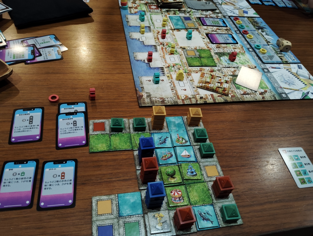 街にたくさんのビルを建設しても得点カードが無いと得点は0点になるし、得点カードがたくさんあってもビルが建設されてないと0点。