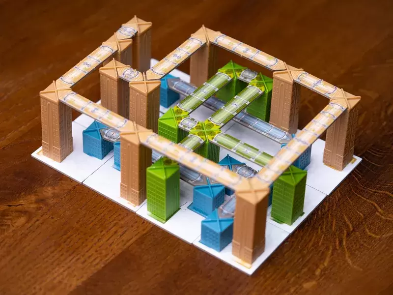 タイルを使って都市を建設するゲームです。タイルには3つの高さのビルが2本書かれています。タイルを使い3×3ないしは3×4の都市を作るように配置していきます。