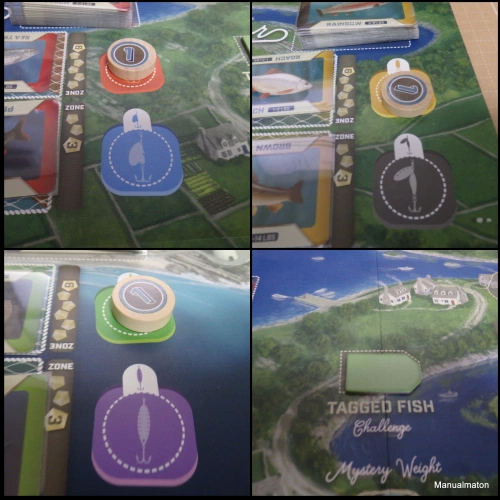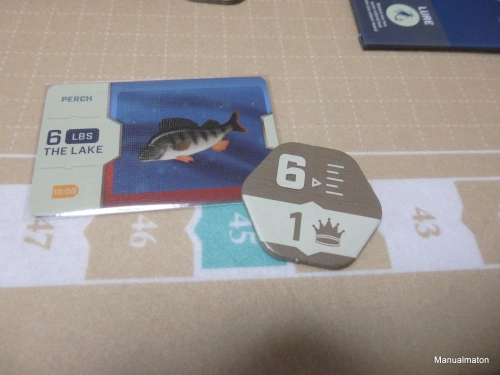 寡黙な釣り人が魚を釣り上げた場合、カードをめくって重さを確認します。それがミステリー重さチャレンジと一致していた場合、寡黙な釣り人はそのタイルを自動的に獲得します。(もちろん、プレイヤーが引いた場合はプレイヤーが獲得します)