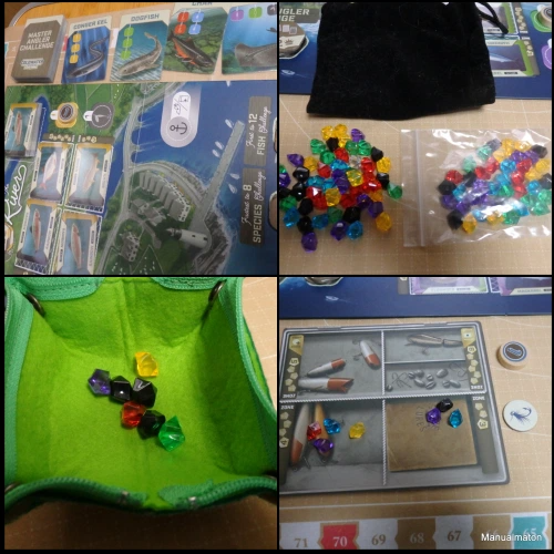 釣り餌の袋から餌を1個引きます。この時、引いた餌の色のスペースに釣り人コマが置かれていた場合、時計回りに次のスペースに移動させます。移動の順番は