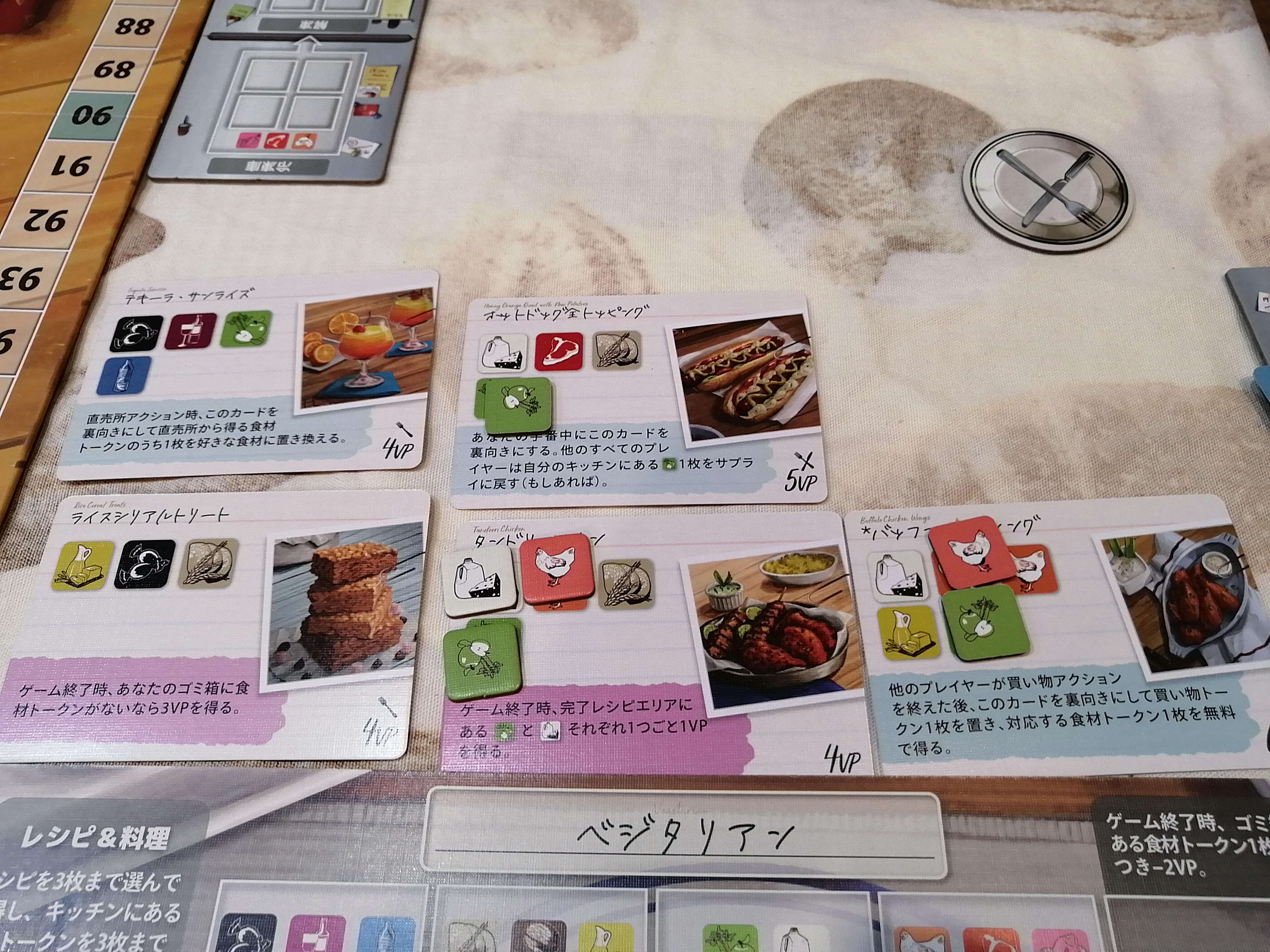 食材調達は2個のダイスを振って出目の列にある食材を調達。列以外の食材はお値段がお高めです。このゲームでは出目的に水や肉は高級品です。レシピ調達&調理は食材を適応するレシピに使用し必要食材が揃うと料理が完成し、食べて食材は自分の体内に吸収されます。