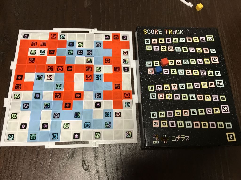 テーマもよくって、コプラスちゃん可愛くって、テーマにあった感じのキレイなアクリル板で、あまりボードゲームやったことない人とも遊びやすいような気がします。