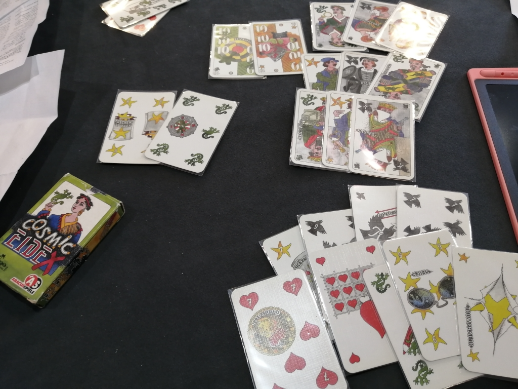 先ほど、得点トップを目指すと書きましたが全トリック獲得したら間違いなくトップになりますが、そうすると得点合計で100点を超えてしまい、そうすると自分以外の2人が1勝利点獲得となるので、トップを目指すにも100点を超えないようにしないといけません。3人とも初プレイで探り探りながら、トリテを遊んできてるメンバーなんで慣れるのも早かったですね。