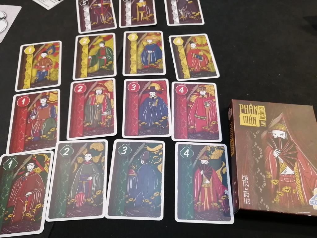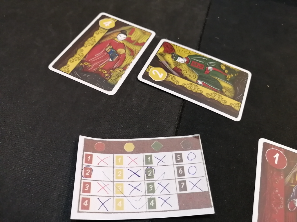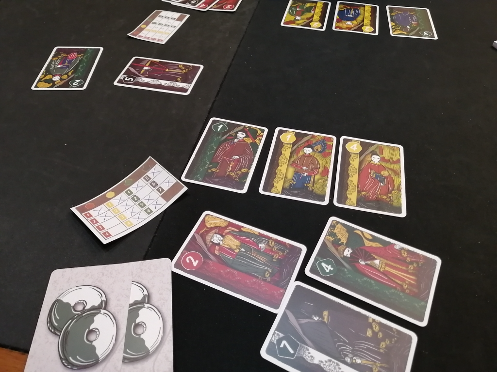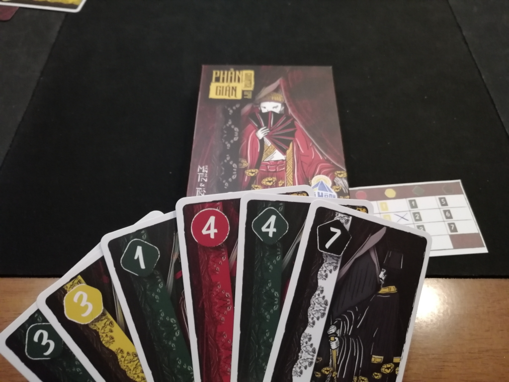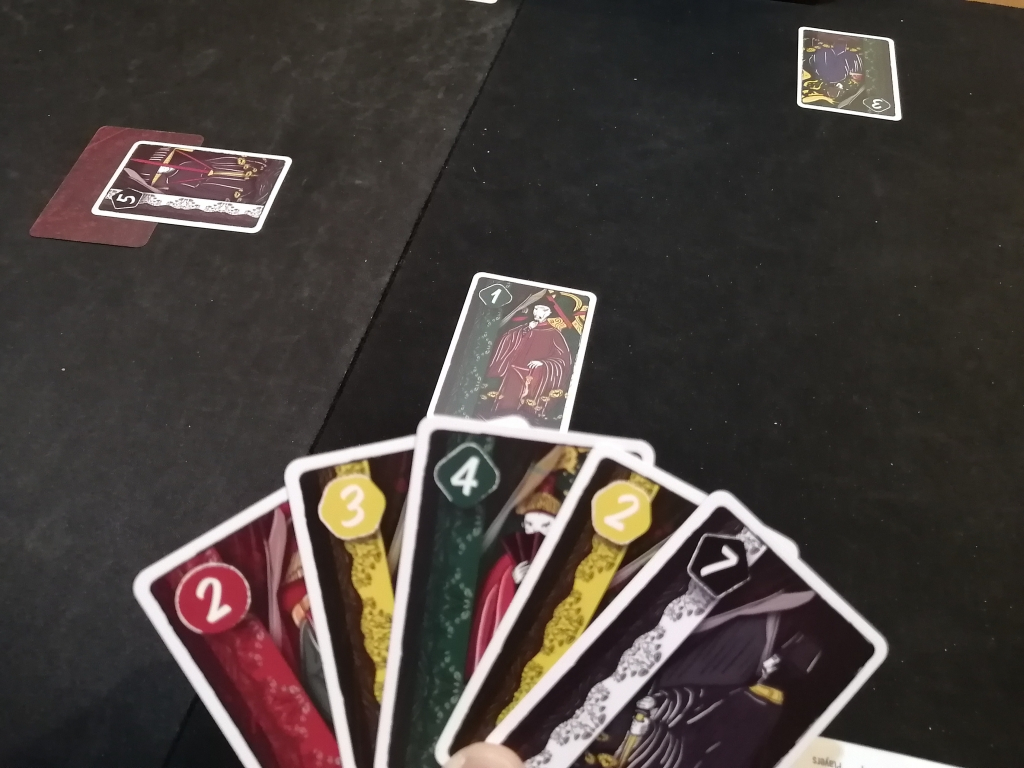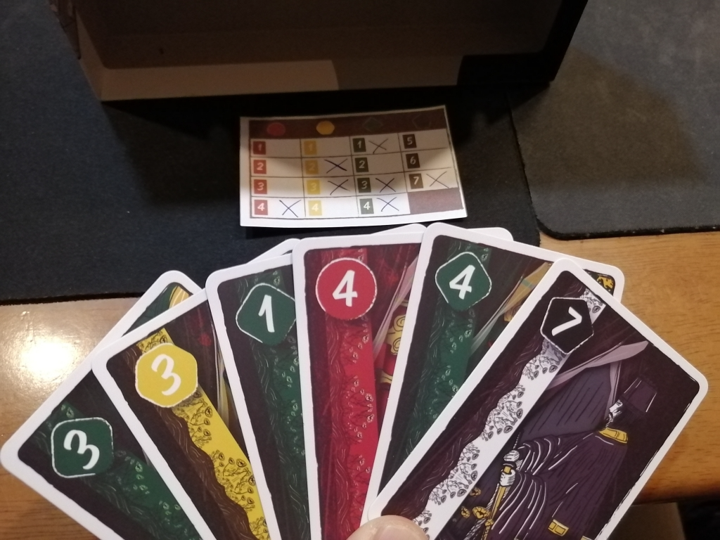 3色1〜4、1色5〜7の計15枚を使用し配られなかった裏向きのカードを当てる2人用ゲーム。先手は7枚、後手は6枚配られて残り2枚のうち1枚は公開され、残り1枚が裏向きで当てるべきカードになります。