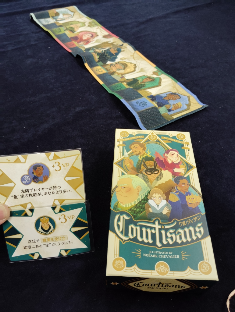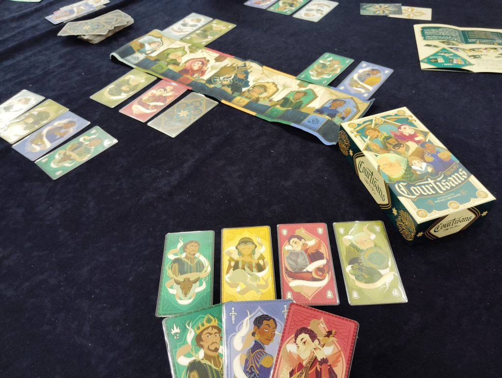 ゲームの流れとしては、手番になれば山札から3枚のカードを引いて1枚は自分、1枚は宮廷、1枚は他プレイヤーに配置していきます。