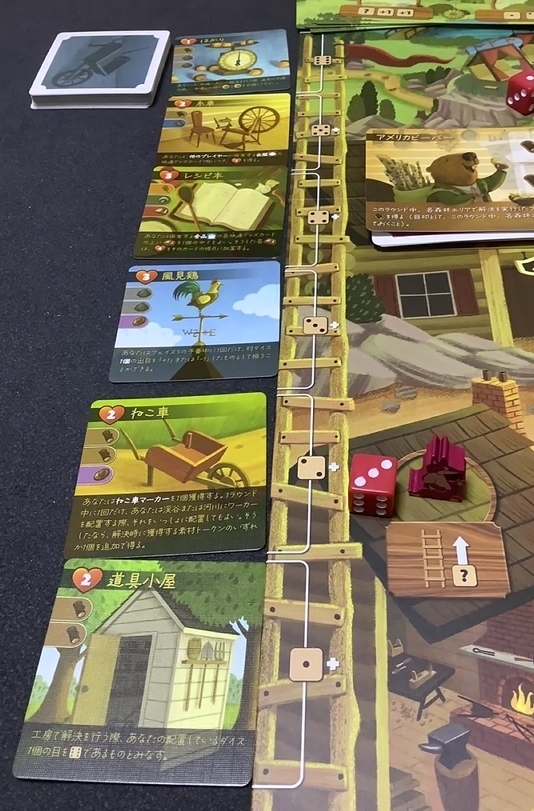 コテージゴマが乗せられ、そのカード特有の特殊効果がもらえます。ただし、コテージゴマは4つしかないので工房のカードも4つまでしかとれません。