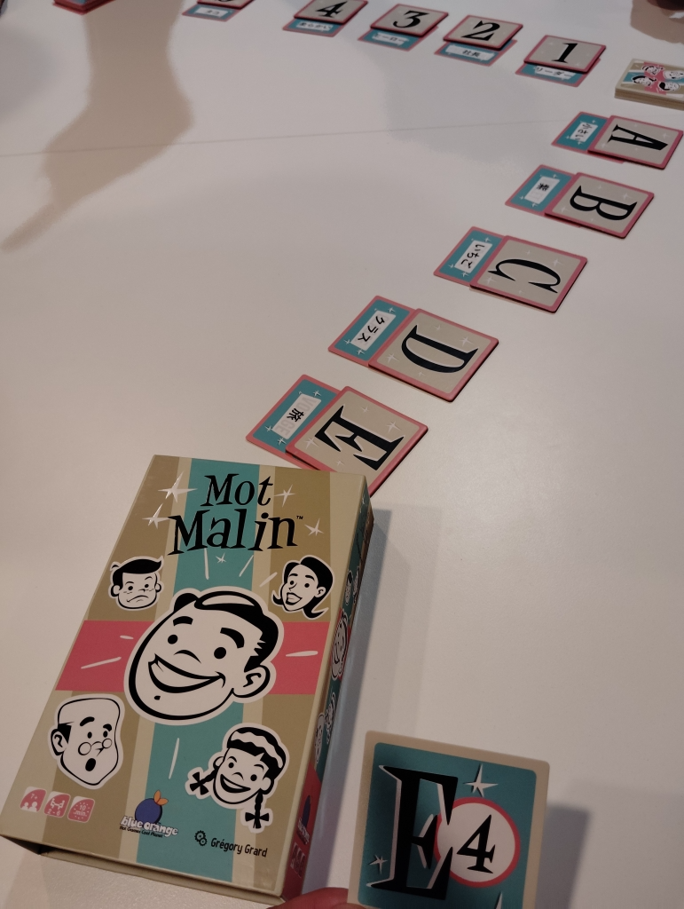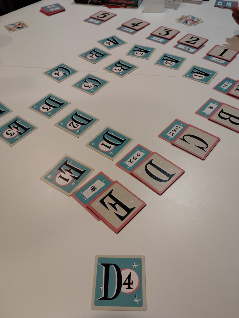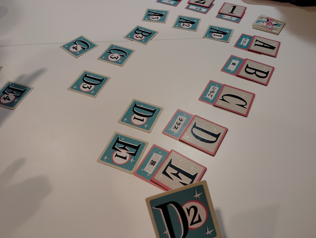 当ててもらえた交差する場所にカードを配置し、外れたら裏向きで捨て札になって山札から新たなカードを引いて、交差する2つの単語を確認して、共通になりそうな単語を宣言を繰り返します。
