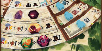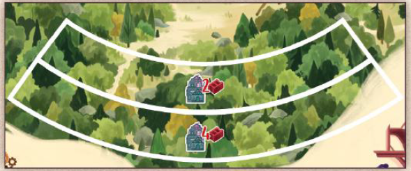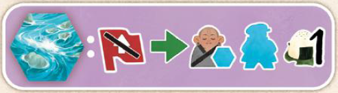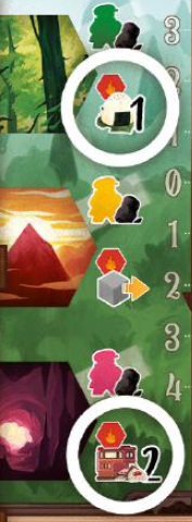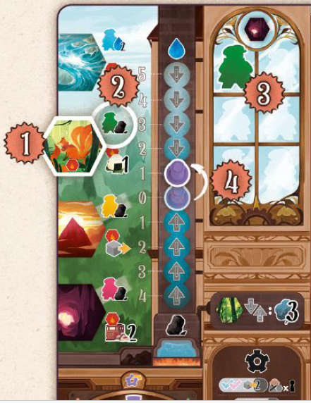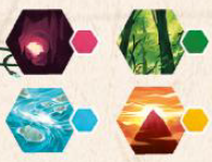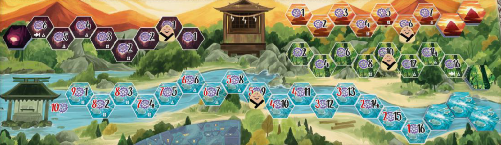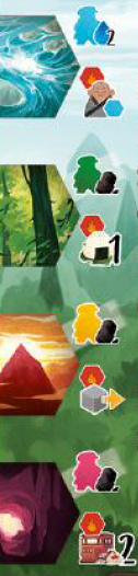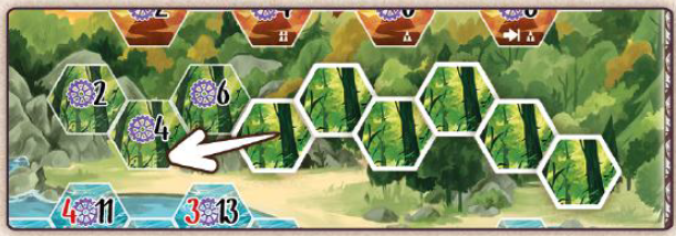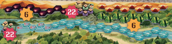 ◦ 4人用ゲームの場合、👤👤👤と👤👤👤👤のアイコンでマークされたスペースにのみ2つの土地ヘクスを配置し、川トラックのすべてのスペースに川ヘクスを配置して覆います。 ◦ 3人用ゲームの場合、👤👤👤アイコンでマークされたスペースにのみ2つの土地ヘクスを配置し、左端の4つのスペースを除く川トラックのすべてのスペースに川ヘクスを配置して覆います。 ◦ 1人または2人用ゲームの場合、左端の8つのスペースを除くすべての川トラックスペースに川ヘクスを配置して覆います。 ◦ その後、土地トラックの他のすべてのスペースに1つずつの土地ヘクスを配置します。 |