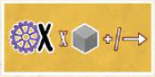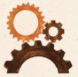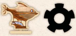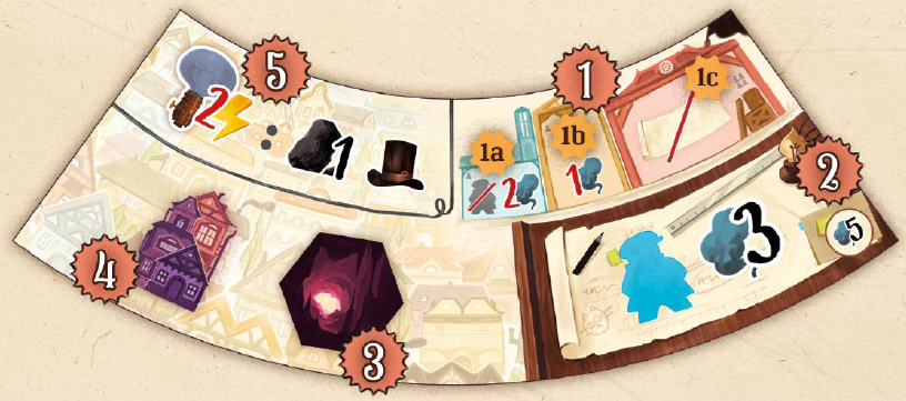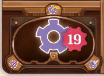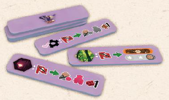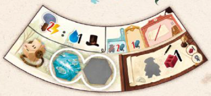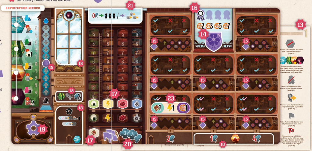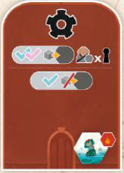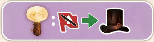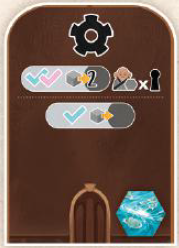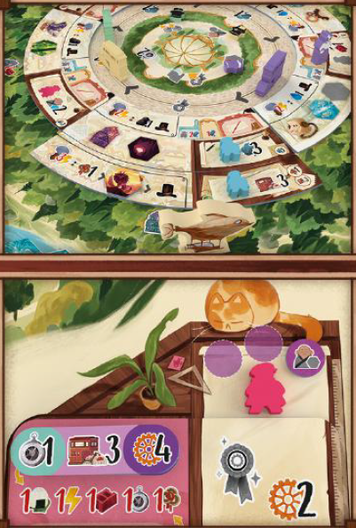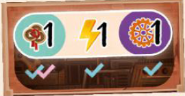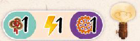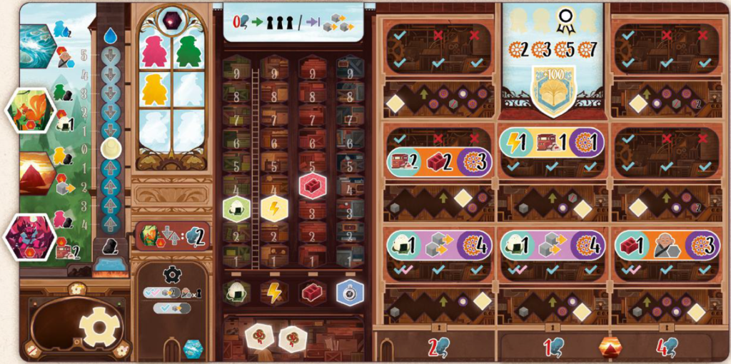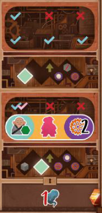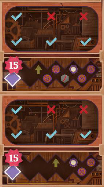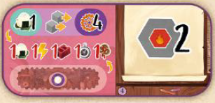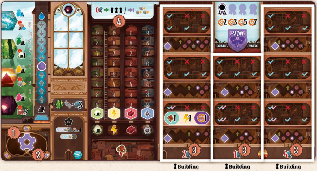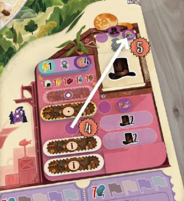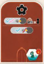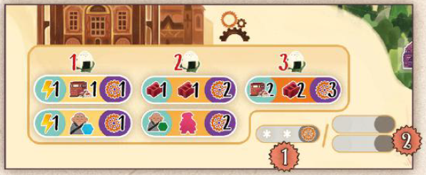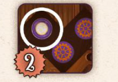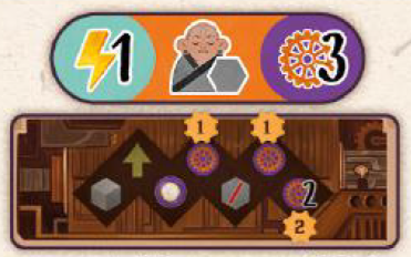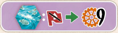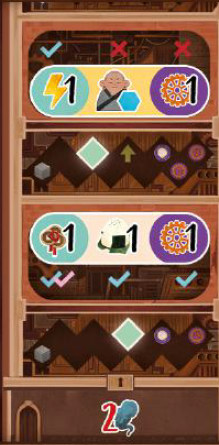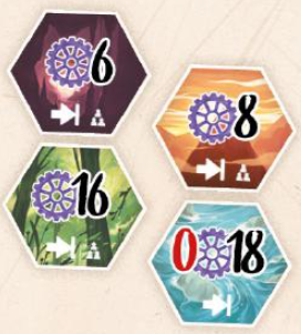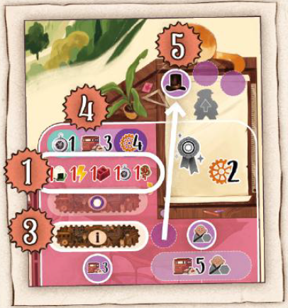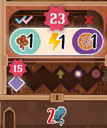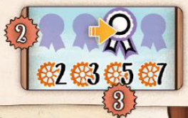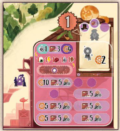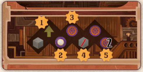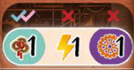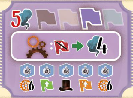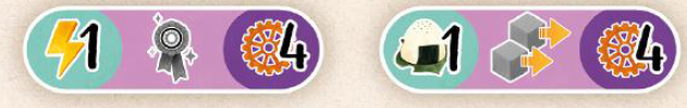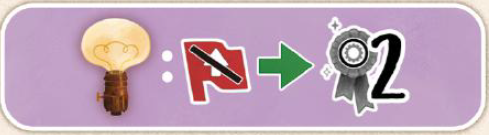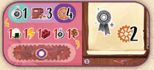歯車アイコンは勝利点(VP)を表します。アイコンが橙色の場合は、ただちにVPを獲得します。紫の場合は、ゲーム終了時に獲得します。アイコンの横の数字が黒の場合はポイントを獲得しますが、数字が赤の場合はポイントを失います。発明の進捗トラックのアイコンは、その発明の右端に記載されているVPを(1回または2回)獲得することを示します。