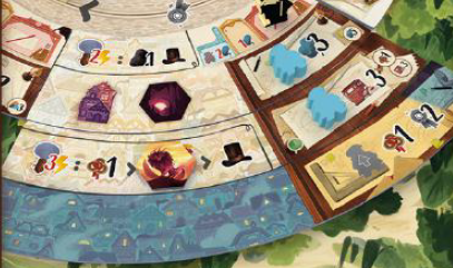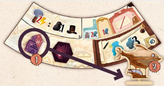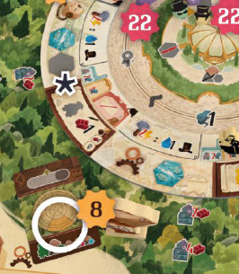 22) 虫バスをメインボードの左上のレールスペースに置き、名声マーカーを同じ地区の最も内側スペースに配置します(好きな面を上にして)。