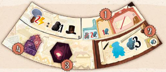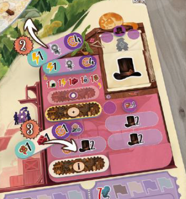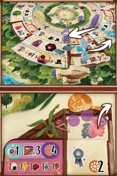 あなたが都市ターンを選択した場合、最初に、①あなたのマグネイトを時計回りに1または2地区を移動する必要があります。蒸気を使用することでさらに先に移動することもできます。その後、以下の順序でアクションを行います: