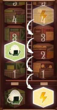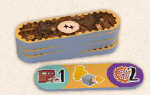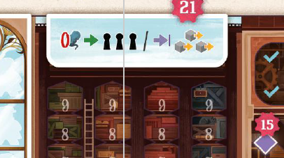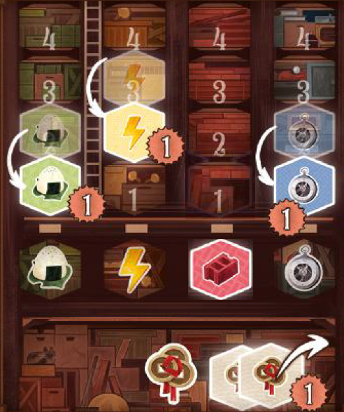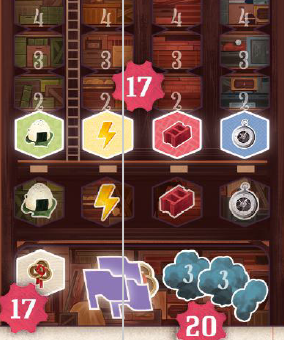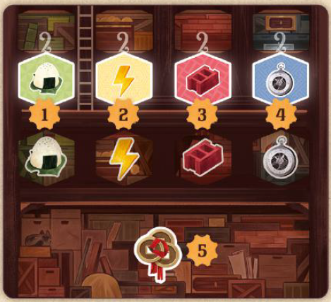 17) 食料、建築資材、エネルギー、高級品の各トークンを倉庫内のそれぞれのトラックの「1」スペースに配置し、富トークン1つをサプライから倉庫に配置します。 |