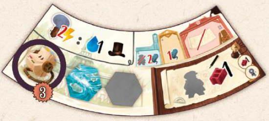 この発明進捗トラックのスペース①に到達すると、3VPを獲得します。 最後のスペース②に到達すると、ただちに3 VPを2回(合計6 VP)獲得します。 |