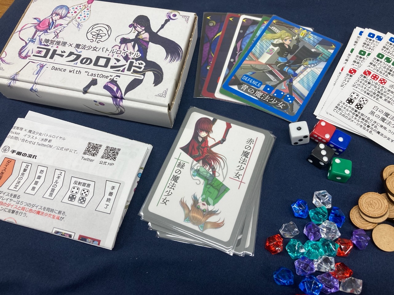 各魔法少女には対応する《色》があって(黒・白・赤・青・黄)円陣を組んで対峙しているところに、それぞれの色のサイコロを5個いっぺんに振り、《最も大きい目》が出た魔法少女が、基本的に両隣のうち誰かを《攻撃》します。(攻撃相手は手番プレイヤーが決定します。攻撃したくなくても必ずどっちかを攻撃しなければならないのです。)