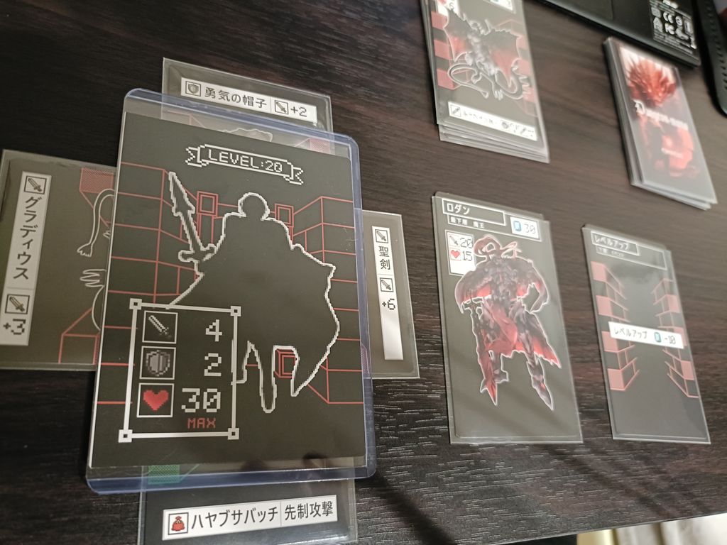 カードのみのコンポーネントながら、装備やアイテム、レベルアップ、体力ゲージまで表現できているのは素晴らしい。