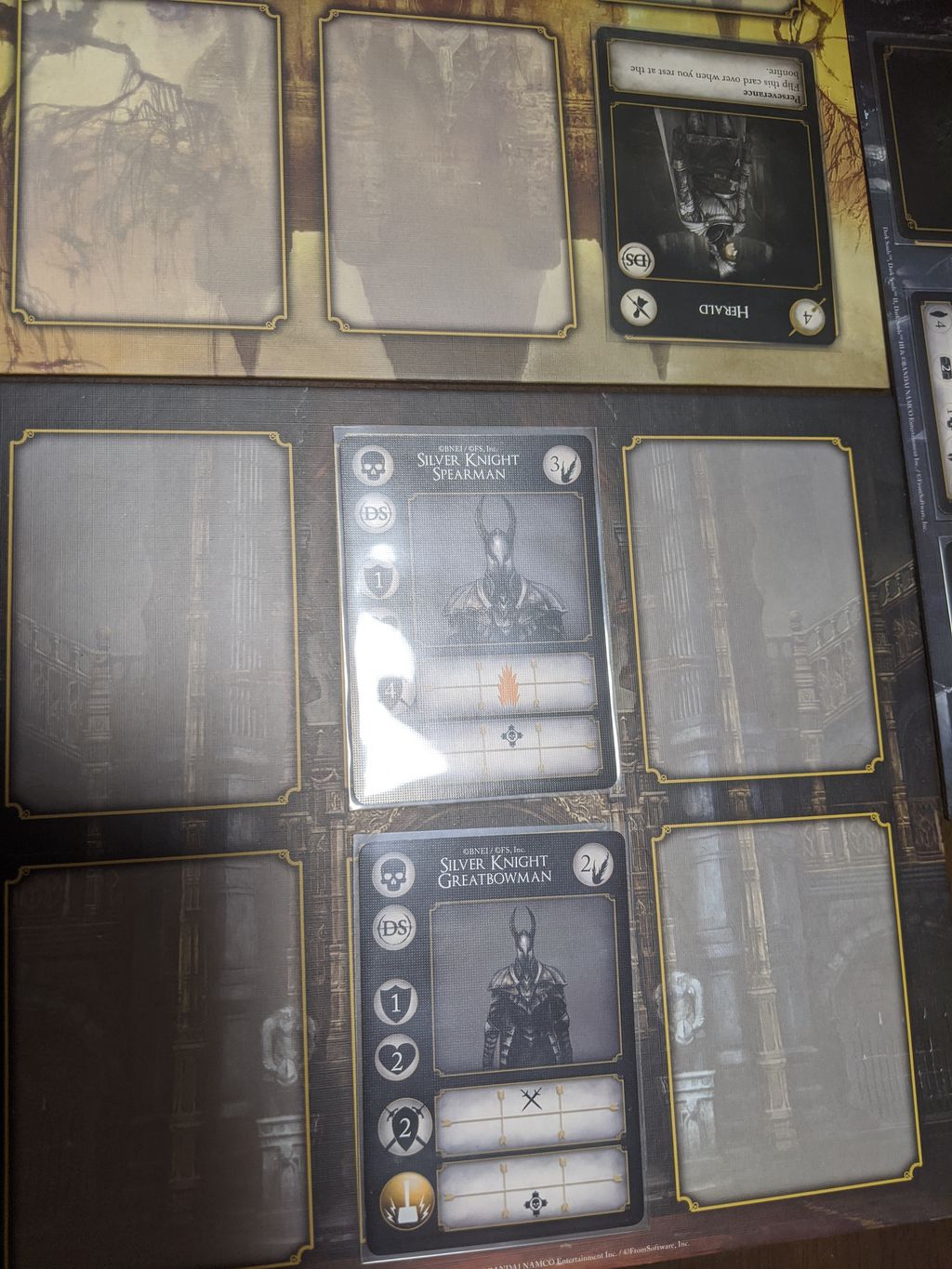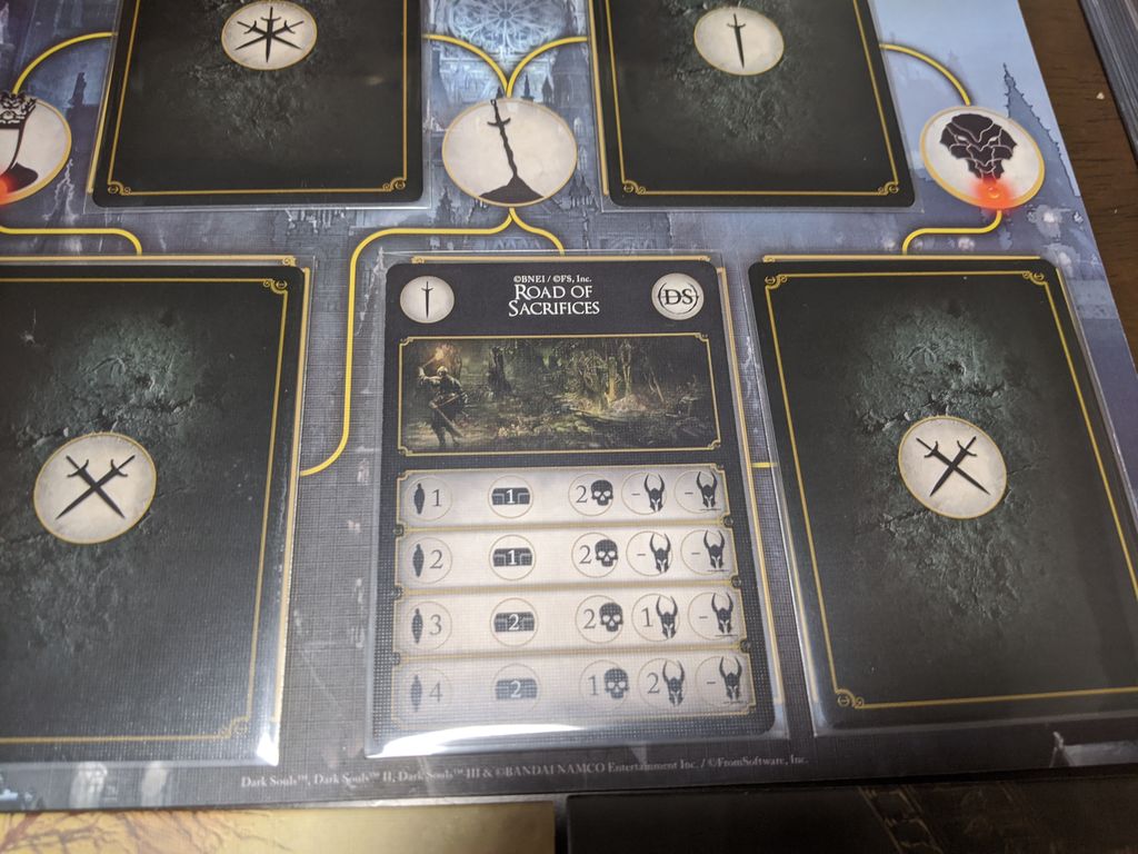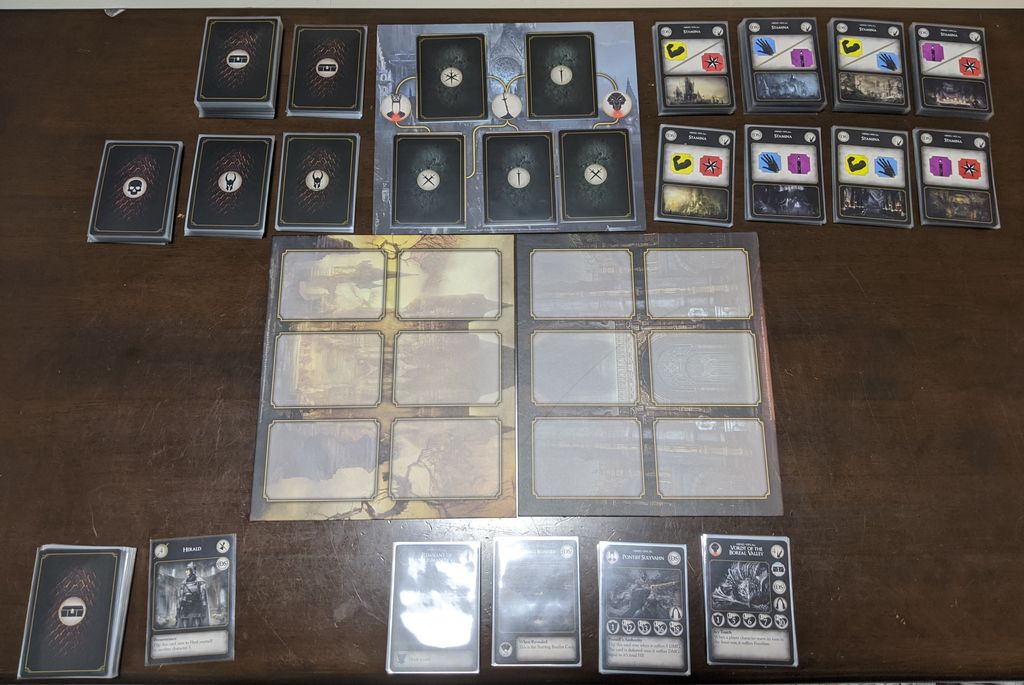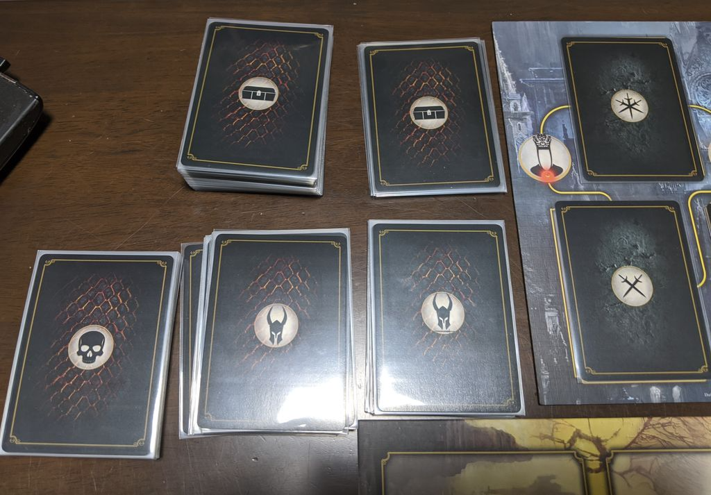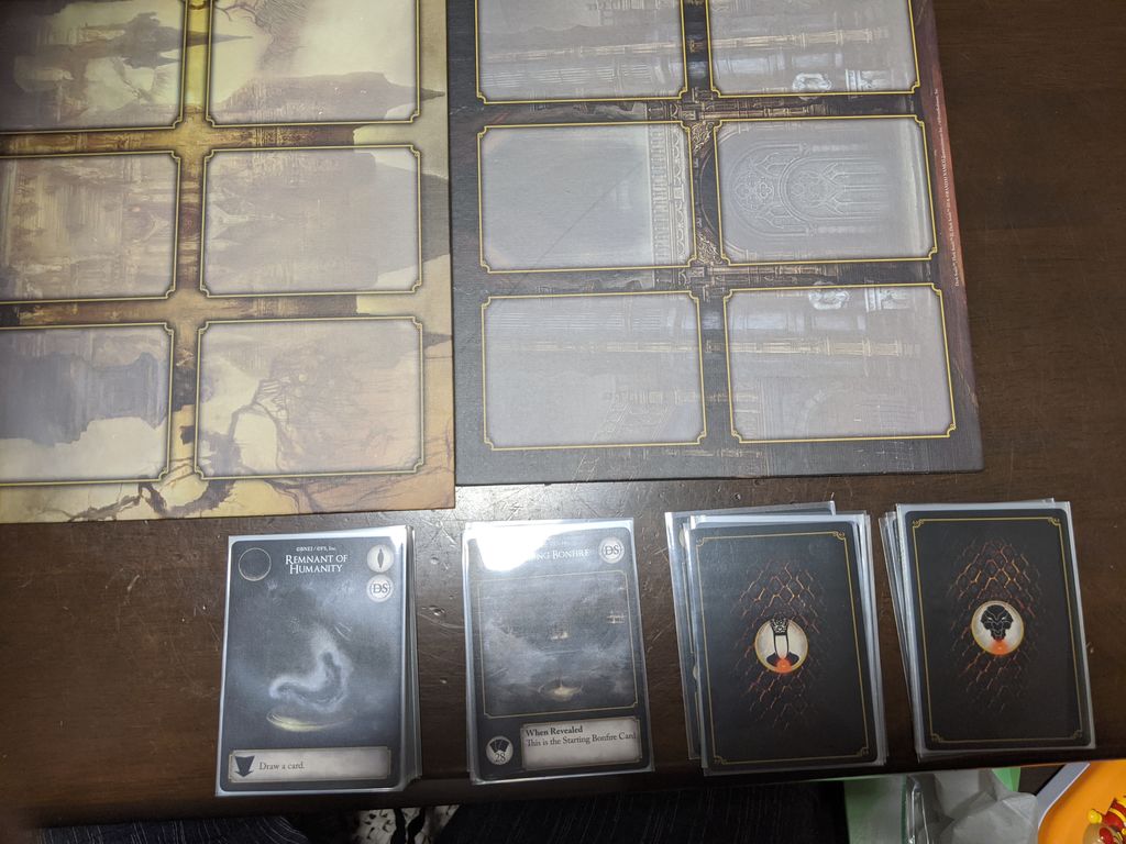 5.バトルボード(下の2枚のボード)の下にボスカード、デッキ、篝火カード、戦利品ゾーン、インベントリゾーンを作れば場の準備は完了