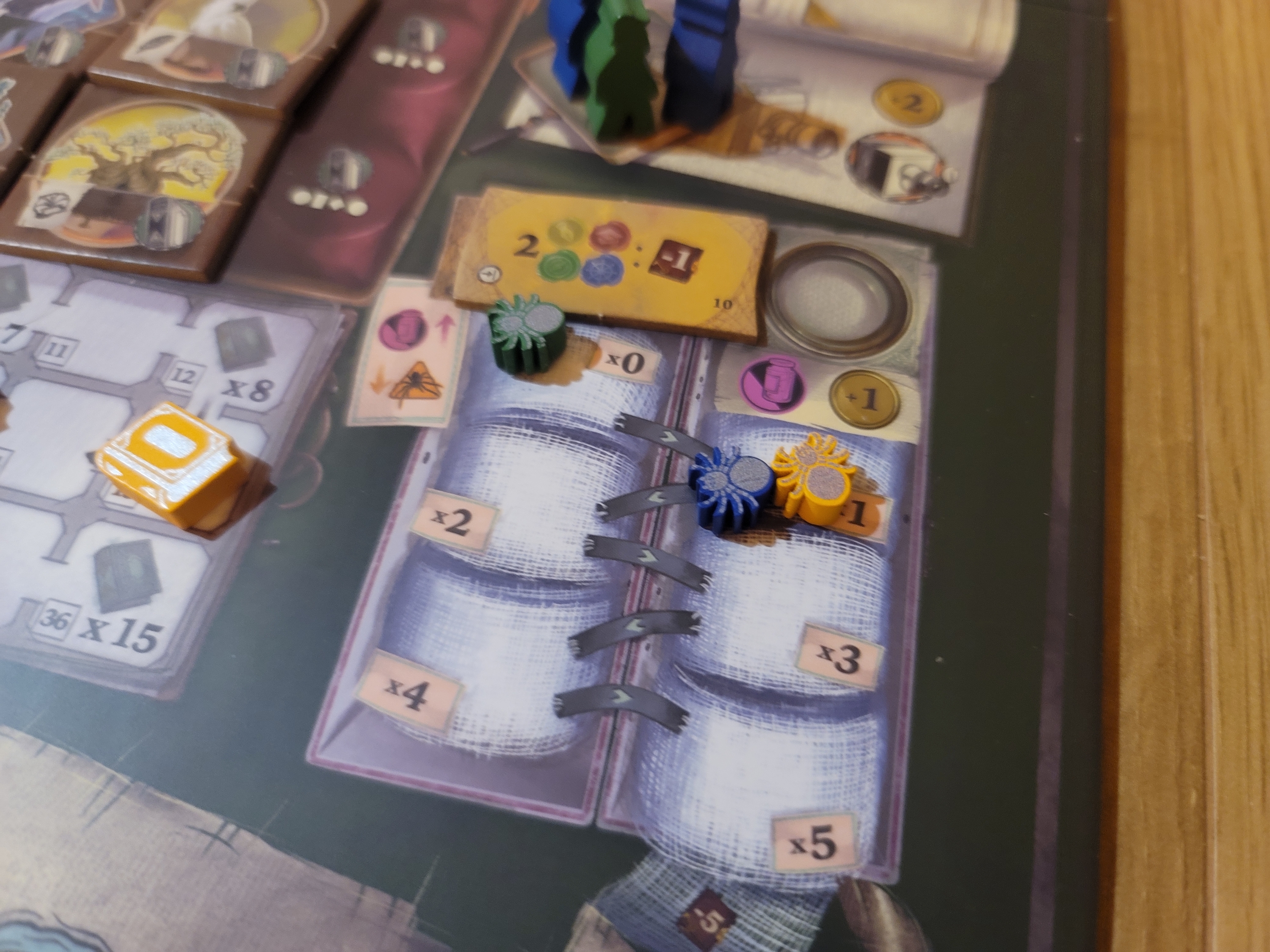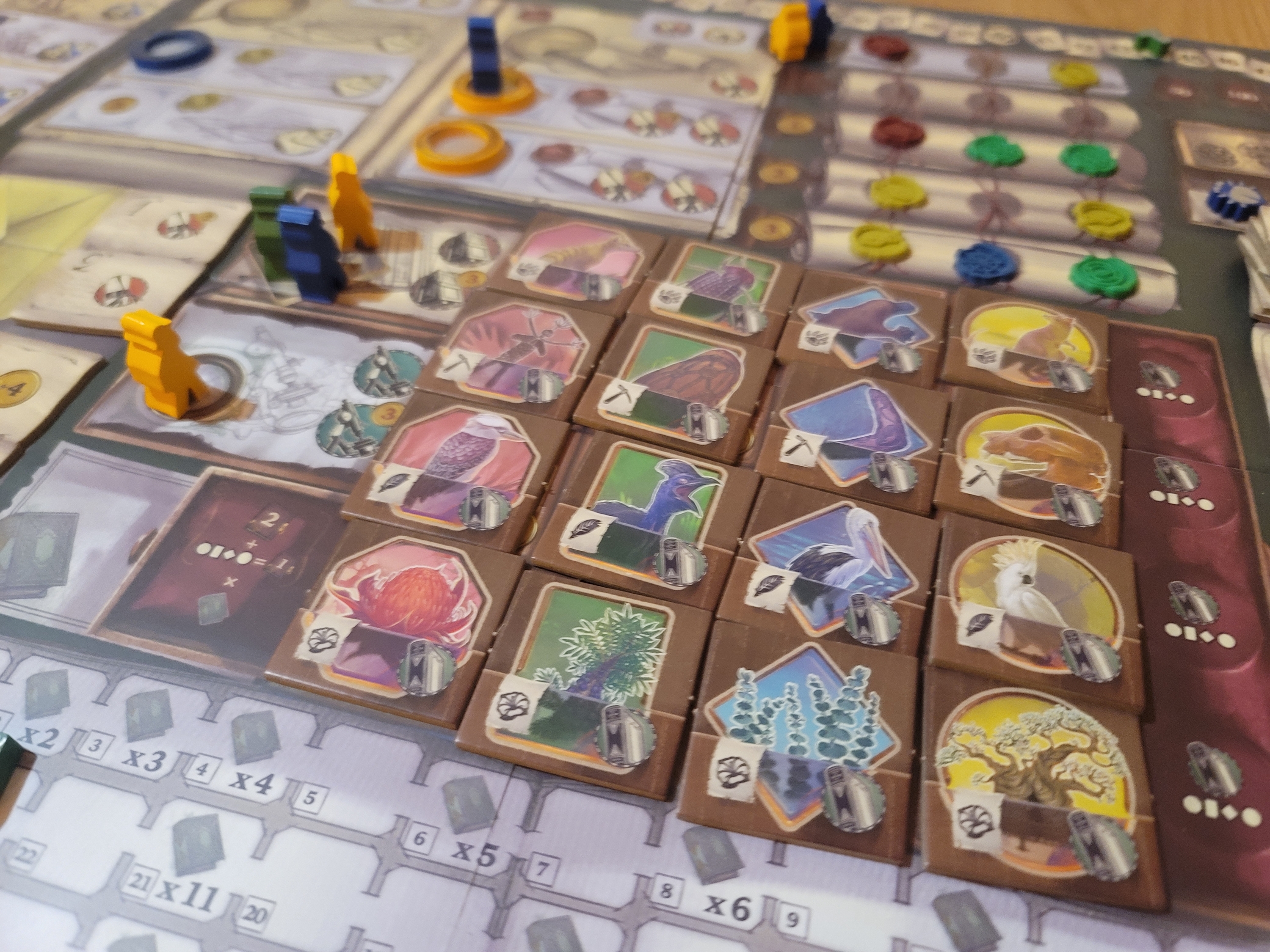 一番の目玉要素。探検や航海で先行してリボンを通過した際や、標本を初めて採取した際に、危険トラックが増加します。危険トラックが進んでいると、ラウンド終了時に進んだ数×大きなペナルティを受けることに。標本や封蝋、一時知識トークンなど、ラウンドごとに決められた物を危険トラックの数分捨てなければならず、捨てられなかった分は失点となります。中には探検家コマのような、捨てると建て直しが難しい深刻なペナルティもあったり。このペナルティと、探検トラックや標本採取で先行するメリットを天秤にかける仕組みです。